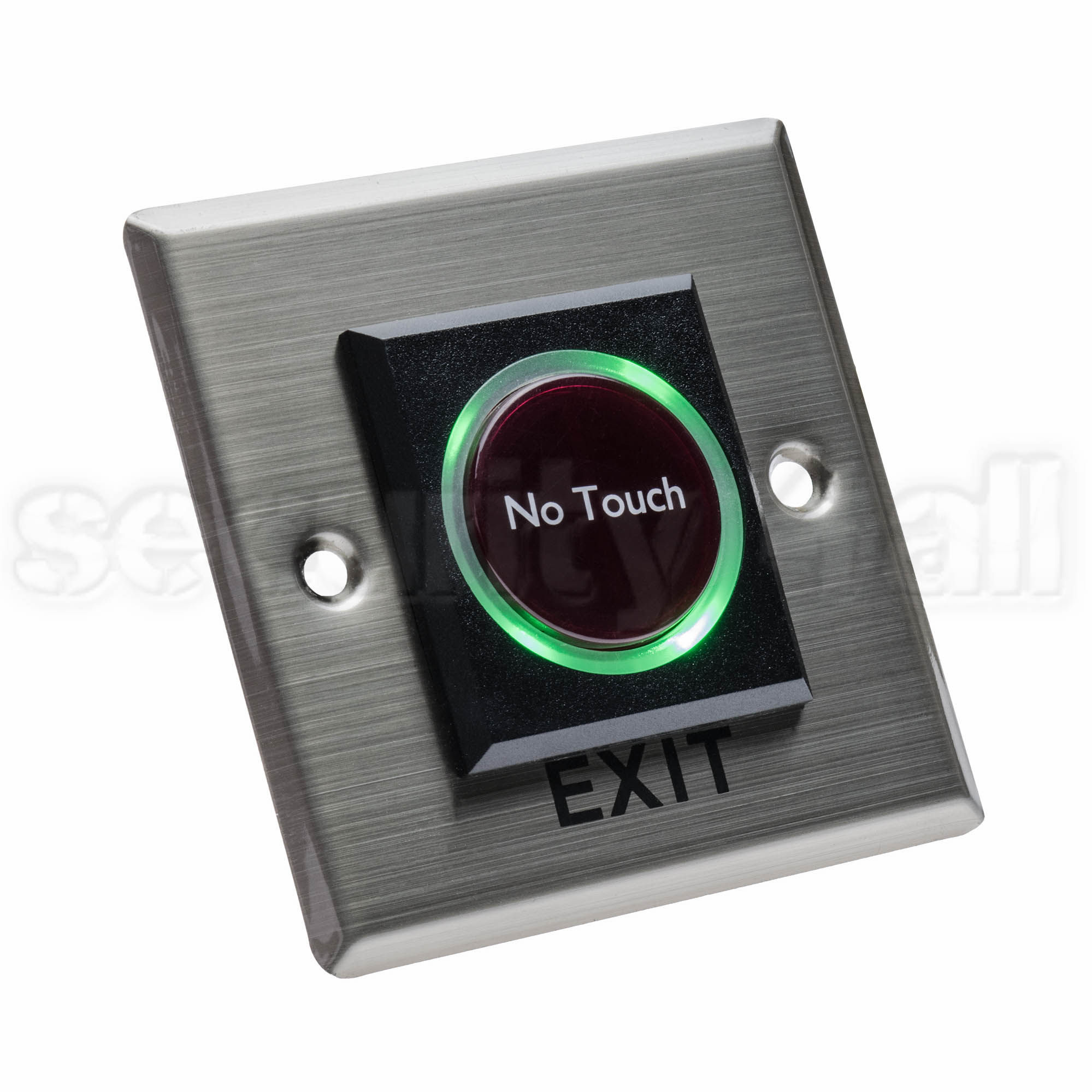 Buton senzorial (No Touch) control acces, tehnologie infrarosu, nu necesita atingere sau apasare ci doar prezenta degetului in fata butonului, panou inox + ABS, panou iluminat rous/albastru, contacte NO/NC/COM, montaj ingropat, dimensiuni 86x86x20 mm