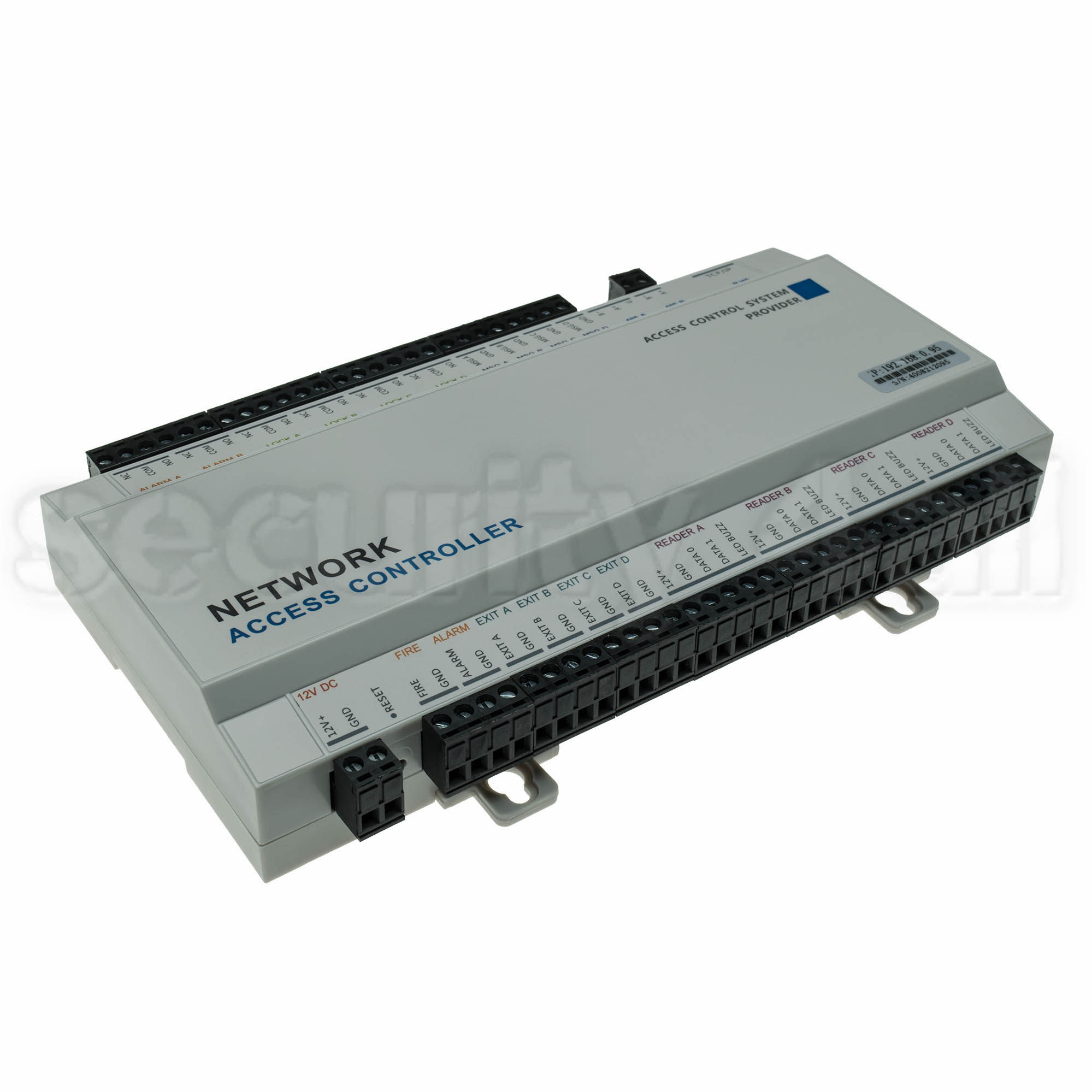 Controller acces si pontaj, pentru 4 usi, accepta 8 cititoare, interfata readere RS-485 si Wiegand, protocol Wiegand 26, 34, 37, compatibil HID, memorie interna 30.000 utilizatori si 60.000 evenimente, 1 intrare alarma, 1 intrare buton incendiu, 4 relee NO/NC usi, 1 iesire alarma NO/NC, 1 iesire incendiu NO/NC, mod deschidere cartela/2 cartele/cartela+PIN/buton/din software, dimensiuni 380x300x75mm, temperatura functionare -25°C~+60°C, retea / Internet RJ-45, cutie plastic cu prindere pe sina DIN, web server inclus, software evoluat inclus, baza de date Acces sau SQL, poate fi integrat in sisteme complexe ce se controleaza de la un singur PC, necesita sursa de alimentare 12V