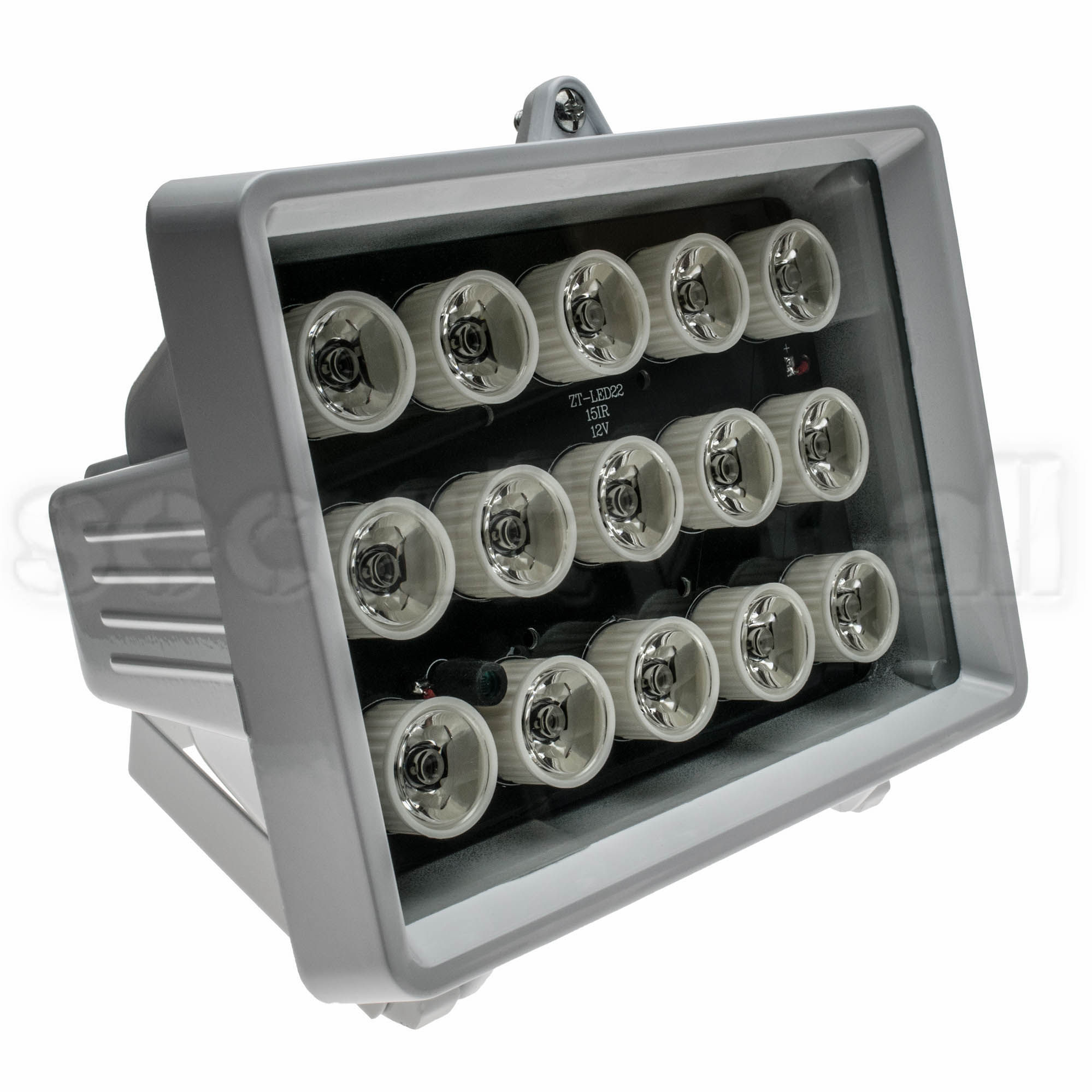 Proiector infrarosu de exterior, 15 LED-uri de 1W, senzor lumina CDS, distanta 60m, unghi 40 grade, alimentare 12Vcc, consum 900mA, driver modulatie in impulsuri, de exterior, protectie la intemperii IP65, temperaturi de lucru -20°C~+50°C, suport inclus, carcasa metalica alba, dimensiuni 175x125x115mm