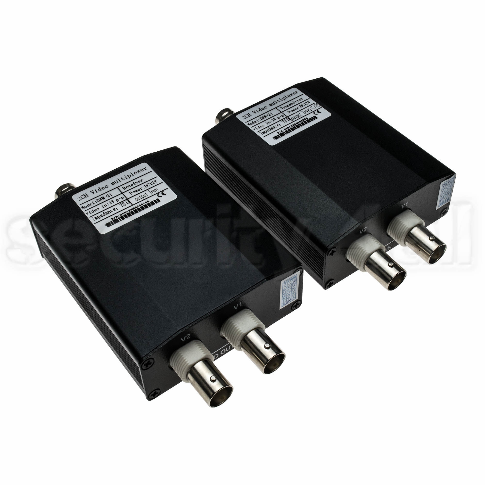 Multiplexor video 2x1, permite transmisia a 2 semnale video peste un singur cablu coaxial, distanta de transmisie 500-1000m pe coaxial de Cu si 250-500m pe coaxial de aliaj, transmitator si receptor, mufe BNC, ambele necesita 12Vcc, consum 300mA.