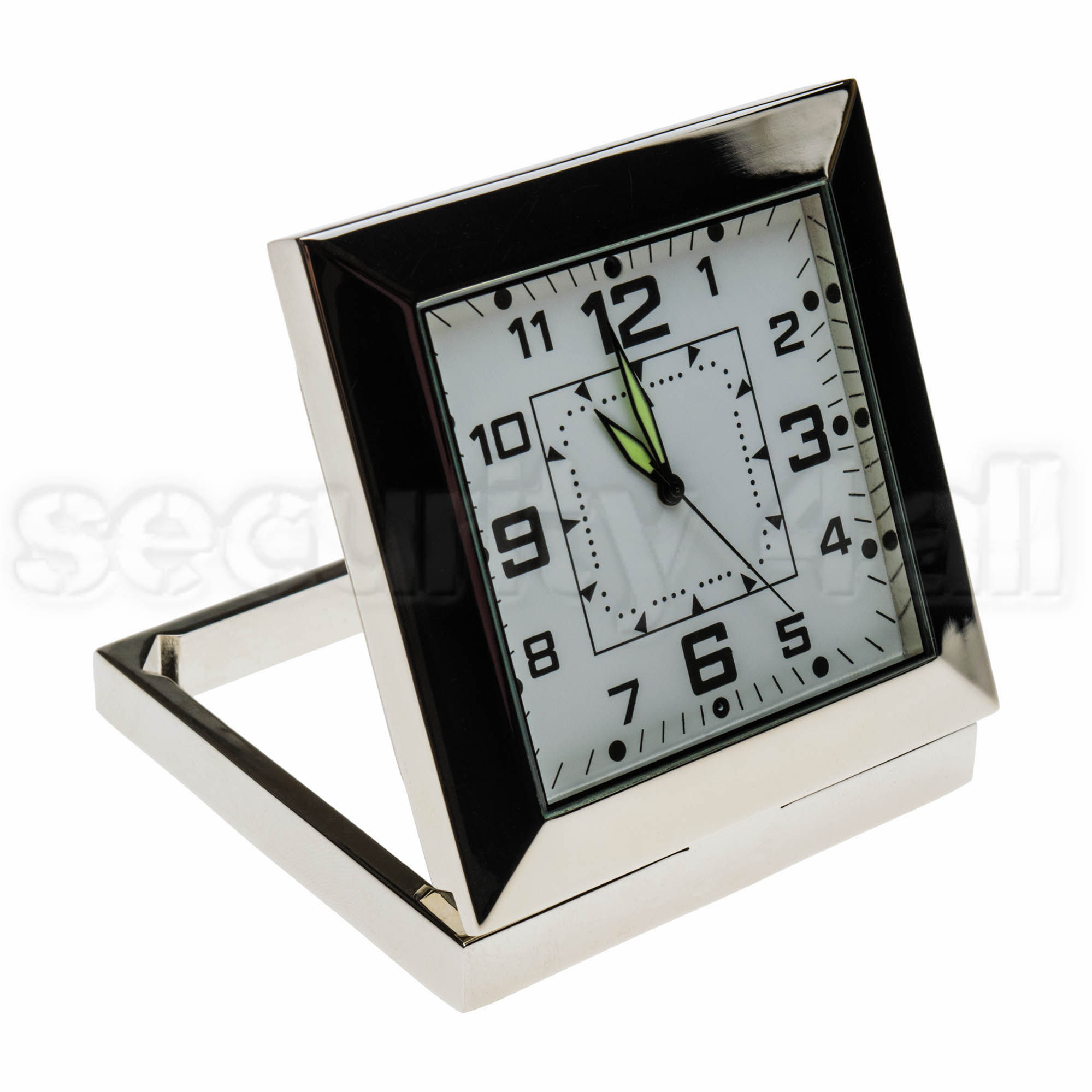 Camera ascunsa in ceas functional de masa, DVR cu detectie de miscare inclus, audio, film 640*480 @ 30FPS, foto 1280x960, slot micro SD max. 16GB, acumulator inclus pentru autonomie de 2 ore de inregistrare video continua, poate inregistra nelimitat si in timpul incarcarii sau conectarii la alimentare, port USB si cablu, dimensiuni 66x66x17mm.